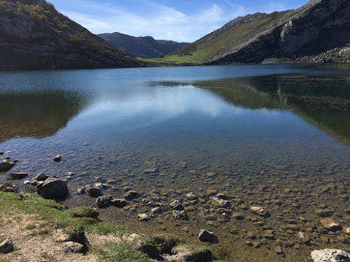 Today the Parque National de Los Picos de Europe beckoned. Covering 647 sq km and including three massifs, the highest reaching over 2,600 metres we couldn't pass by without a peek (as opposed to a peak). There are no passes through the whole area and we were undecided which way to go so drove along the northern edge on the AS-114, which was a stunning drive in itself, to the town of Cangas de Onis. There the young lady in the tourist information office came up trumps again, advising us which road to take to the two lakes (we'd call them tarns) at Pedro Pidal. We were lucky, from tomorrow the roads will be closed for repair and maintenance. The weather today has been glorious, sunshine and blue skies and not a cloud to be seen so the views were stupendous. The road ends at 1,100 metres and on occasions it was a bit scary with a few naughty hairpins and motorists who seem unaware of the width of their vehicles but we reached the lakes without incident and sat on the lakes edge breathing the freshest, sweetest air. Of course, we've only scratched the surface of this magnificent National Park, we met a couple today by the lake who were from Harrogate and were travelling by motorcycle and had spent a week in the area. The drive back down wasn't as enjoyable as the brakes started overheating - "What's that smell" said Phil, "Smells like somethings burning". - "Just the brakes, darling - nothing to worry about." Halfway down I managed to find somewhere to pull over for a while and let them cool down before we completed the descent.